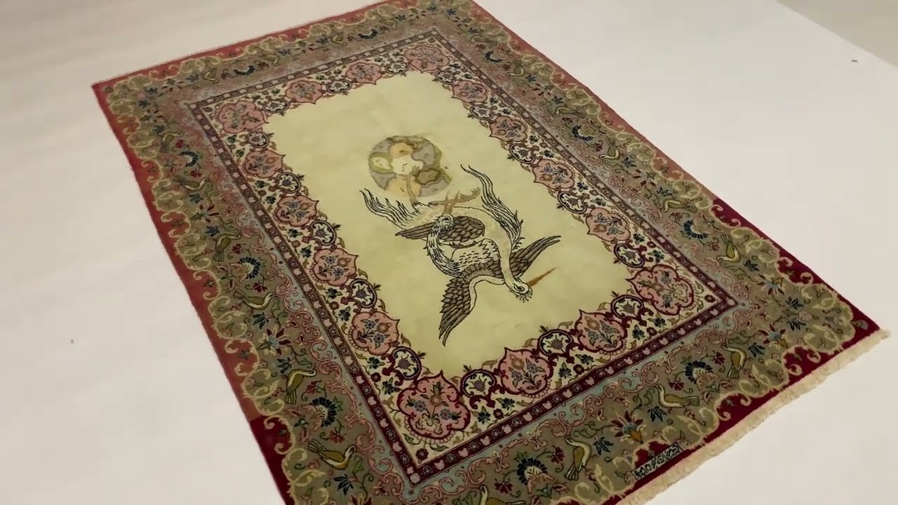 Kashan Teppiche, insbesondere solche aus der Werkstatt von Mohammad Dabir, sind weltweit für ihre exzellente Knüpfqualität und ihre künstlerischen Designs bekannt. Dieser Teppich besticht durch ein faszinierendes zentrales Medaillon, das ein elegantes Vogelmotiv, möglicherweise einen Kranich oder Storch, zeigt – ein Symbol für Glück und langes Leben in der persischen Kultur. Umrahmt wird das Hauptmotiv von detailreichen floralen Mustern und ornamentalen Bordüren, die die hohe Präzision und den ästhetischen Anspruch der Kashan-Meister belegen. Jeder Knoten wurde mit größter Sorgfalt gesetzt, was die unglaubliche Dichte und Langlebigkeit dieses historischen Stücks garantiert.