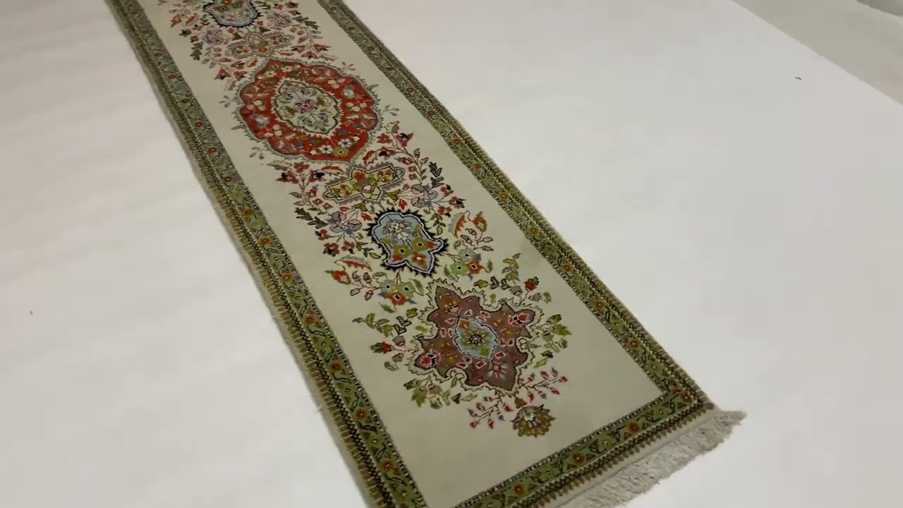 Dieser Tabriz Teppich besticht durch ein klassisches Design, das oft aus eleganten Medaillons oder einem durchgehenden, floralen Rapport besteht, umrahmt von kunstvollen Bordüren. Die Farbgebung ist harmonisch und ausgewogen, typisch für Tabriz, mit einer Palette, die von sanften Cremetönen bis zu tiefen Rot- und Blautönen reicht, durchsetzt mit feinen Details in Beige und Grün. Die Präzision, mit der jedes Detail geknüpft wurde, ist atemberaubend und macht diesen Läufer zu einem wahren Blickfang. Seine feine Textur und der subtile Glanz der Wolle zeugen von höchster Qualität.